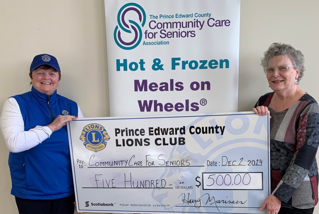 Gail Lynch, President of the Prince Edward County Lions Club, stopped by to present a cheque for $500.00 to Debbie MacDonald Moynes of Community Care (on right). We are extremely grateful to the Lions Club for their generosity. Together we help seniors live at home.