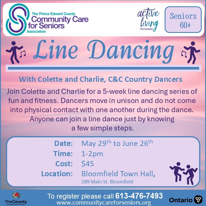 The Active Living Programs (ALP) are offered by The Prince Edward County Community Care for Seniors Association. Through this initiative Community Care offers fitness, social and recreational activities both online and close to where seniors live. Membership in ALP is available to seniors 60+ for $25.00/year/person. Membership benefits include: full access to all programs and events (some programs may have additional fees); meet new friends; discover a new hobby, skill or talent; receive monthly updates of programs via email or a phone call for people without email. For a membership application and a full schedule of upcoming social and recreational programming see the special page on the website at www.communitycareforseniors.org , like the Facebook page, or call 613-476-7493.