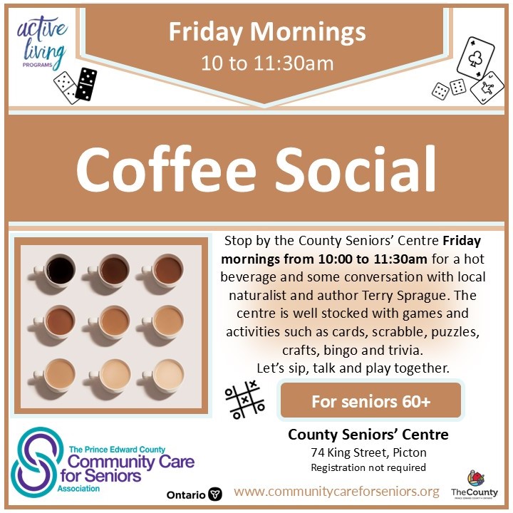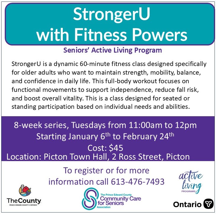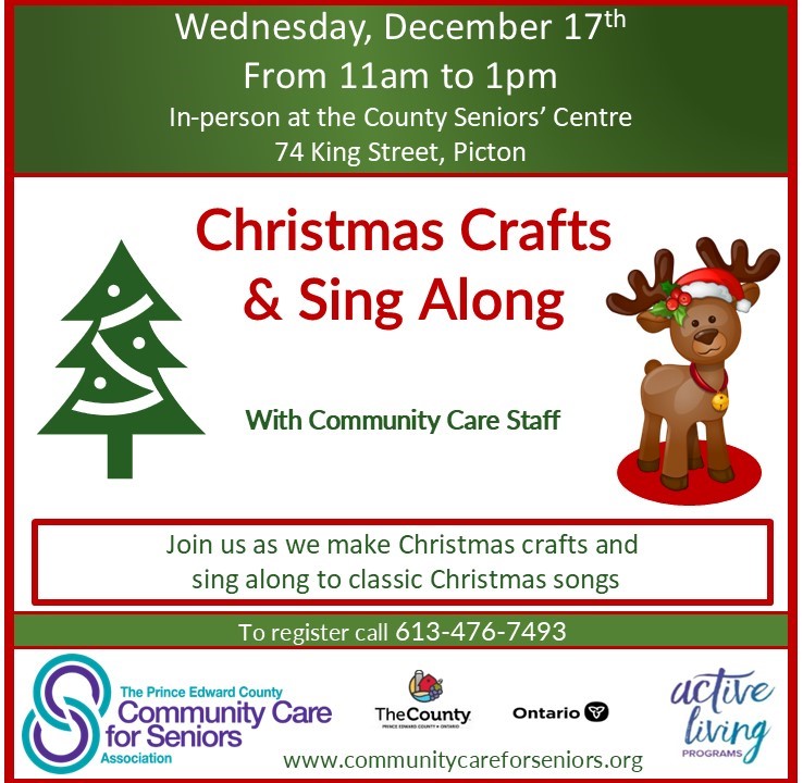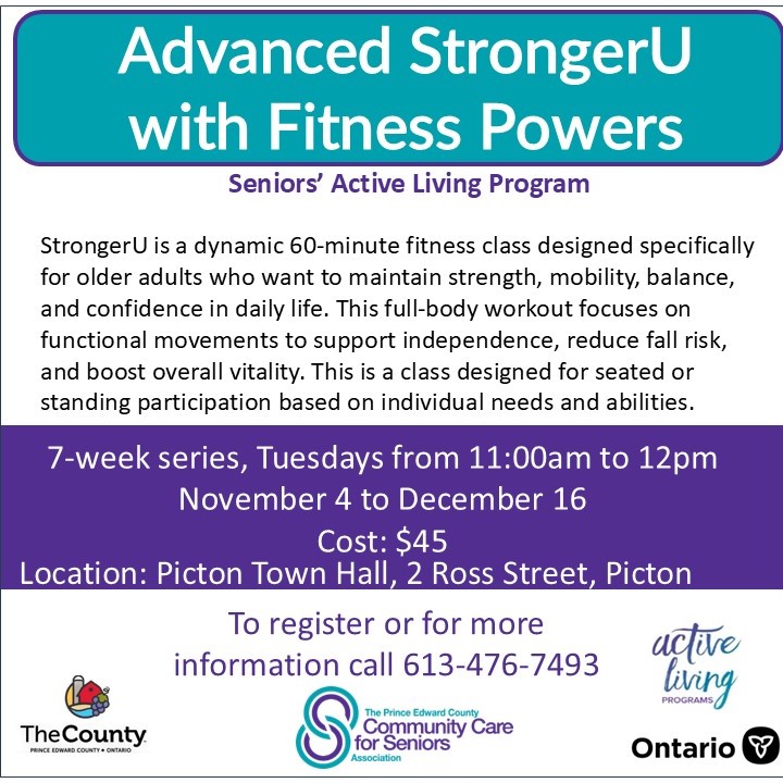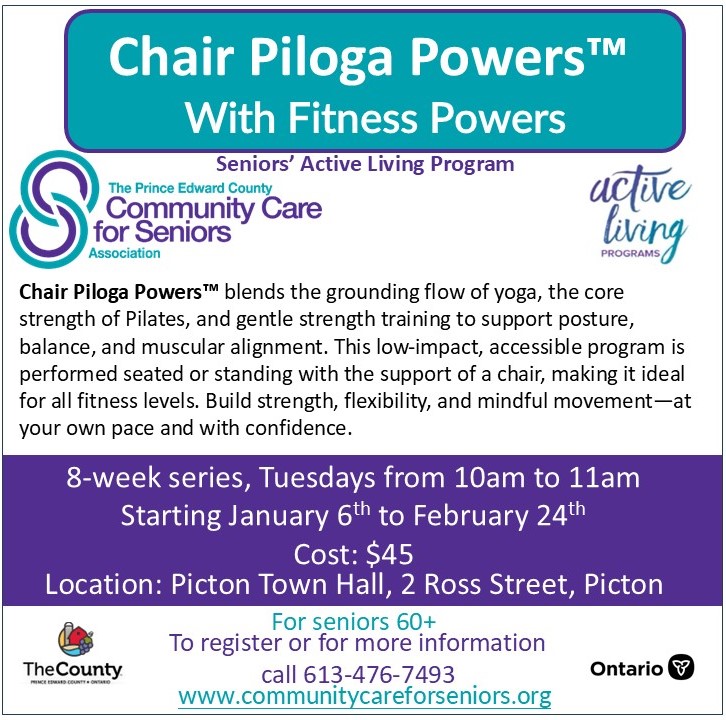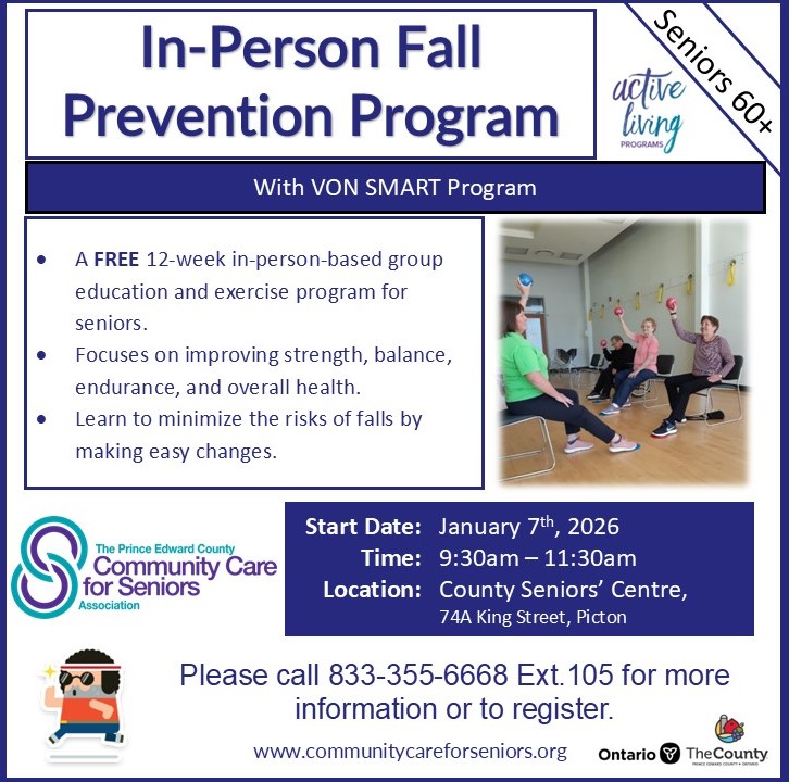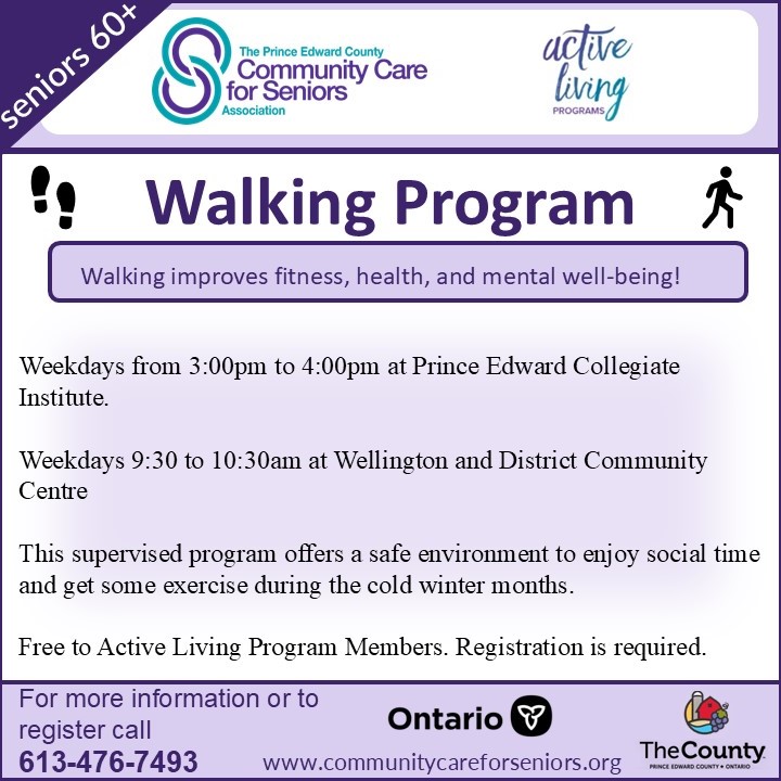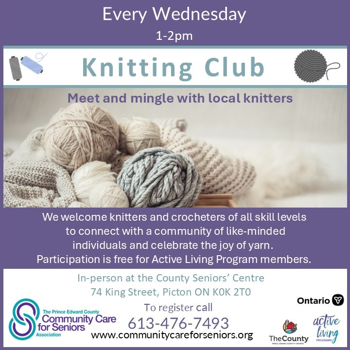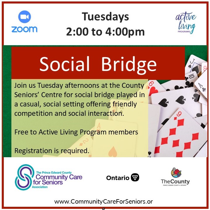 The Active Living Programs (ALP) are offered by The Prince Edward County Community Care for Seniors Association. Through this initiative Community Care offers fitness, social and recreational activities both online and close to where seniors live.  Membership in ALP is available to seniors 60+ for $25.00/year/person. Membership benefits include: full access to all programs and events (some programs may have additional fees); meet new friends; discover a new hobby, skill or talent; receive monthly updates of programs via email or a phone call for people without email. For a membership application and a full schedule of upcoming social and recreational programming see the special page on the website at www.communitycareforseniors.org , like the Facebook page, or call 613-476-7493.